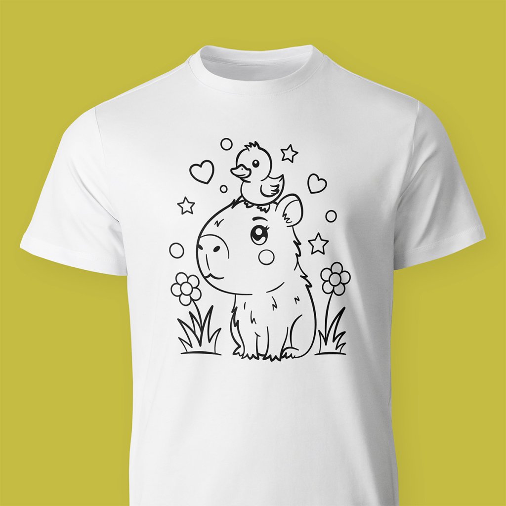 Originální dětské tričko s motivem kapybary k vybarvení. Kreativní zábava pro děti a jedinečný módní doplněk. Ideální volba pro malé umělce i milovníky roztomilých zvířátek. Zabaví děti na dlouhé hodiny a vytvoří krásný, originální kousek.