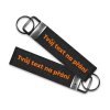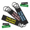 Klíčenka je vyrobena z pevného bavlněného popruhu o šířce 2,5 cm, který je příjemný na dotek a odolný proti opotřebení. Celková délka klíčenky bez očka je 10 cm. Kovová koncovka zajišťuje pevnost a stabilitu, zatímco praktický kroužek na klíče umožňuje snadné připnutí na batoh, kabelku nebo svazek klíčů. Potisk provádíme pomocí nažehlovací fólie, která je trvanlivá a odolná vůči běžnému opotřebení.