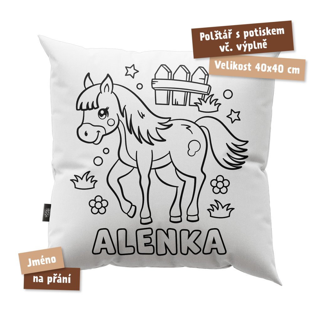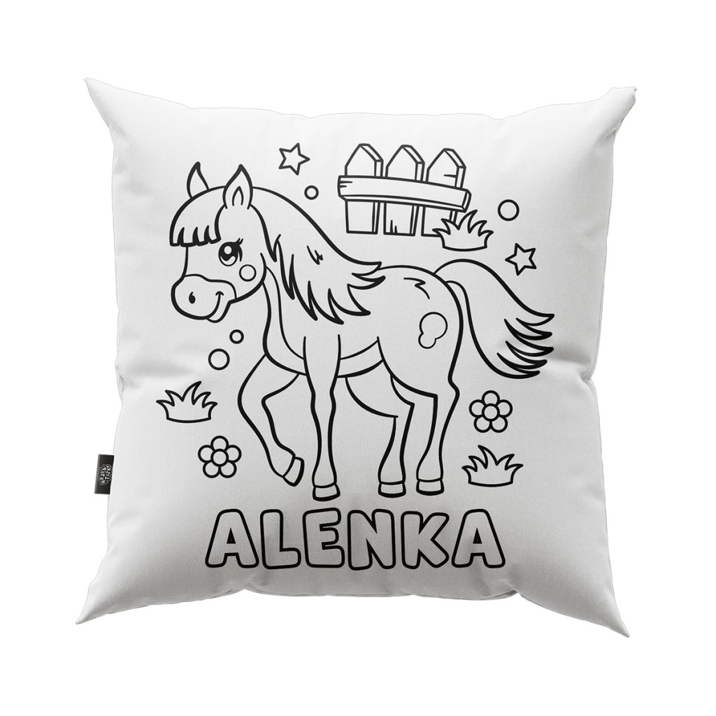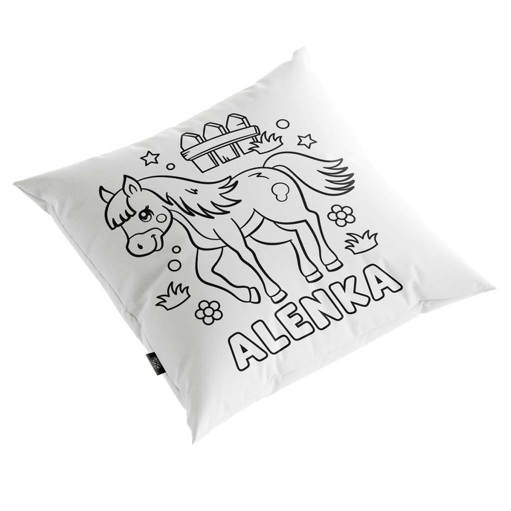 Polštář s kouzelným koníkem a vlastním jménem k vybarvení. Skvělý dárek pro děti, které milují kreativní tvoření. Stačí použít fixy na textil a vytvořit originální dekoraci do dětského pokoje.