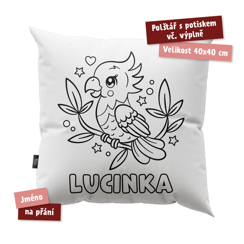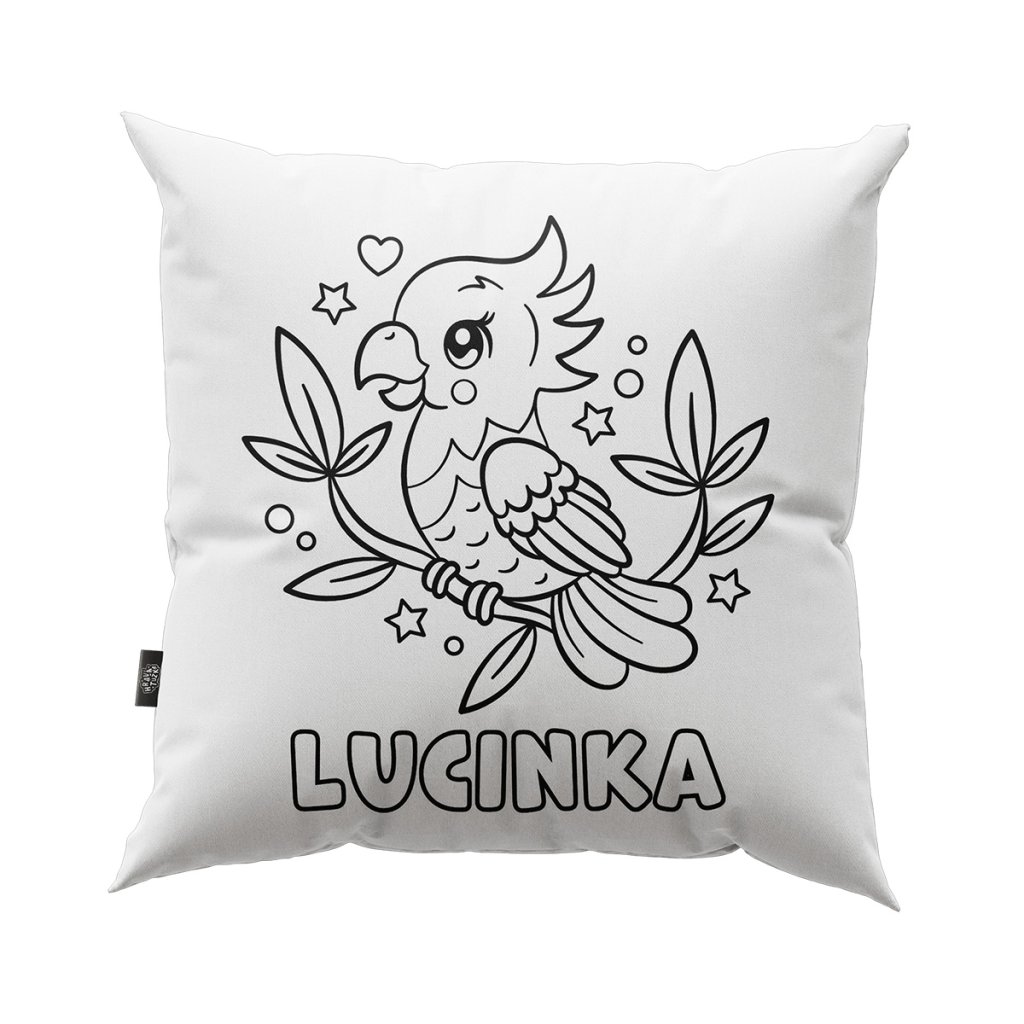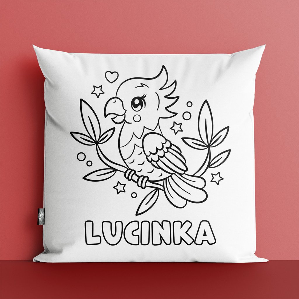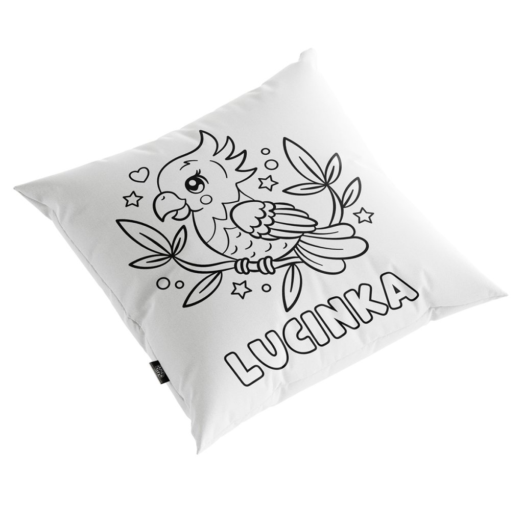 Originální omalovánkový polštář s roztomilým papouškem a vlastním jménem. Skvělý dárek pro malé dobrodruhy, kteří milují papoušky. Stačí vybarvit textilními fixami a vytvořit si jedinečný polštář.