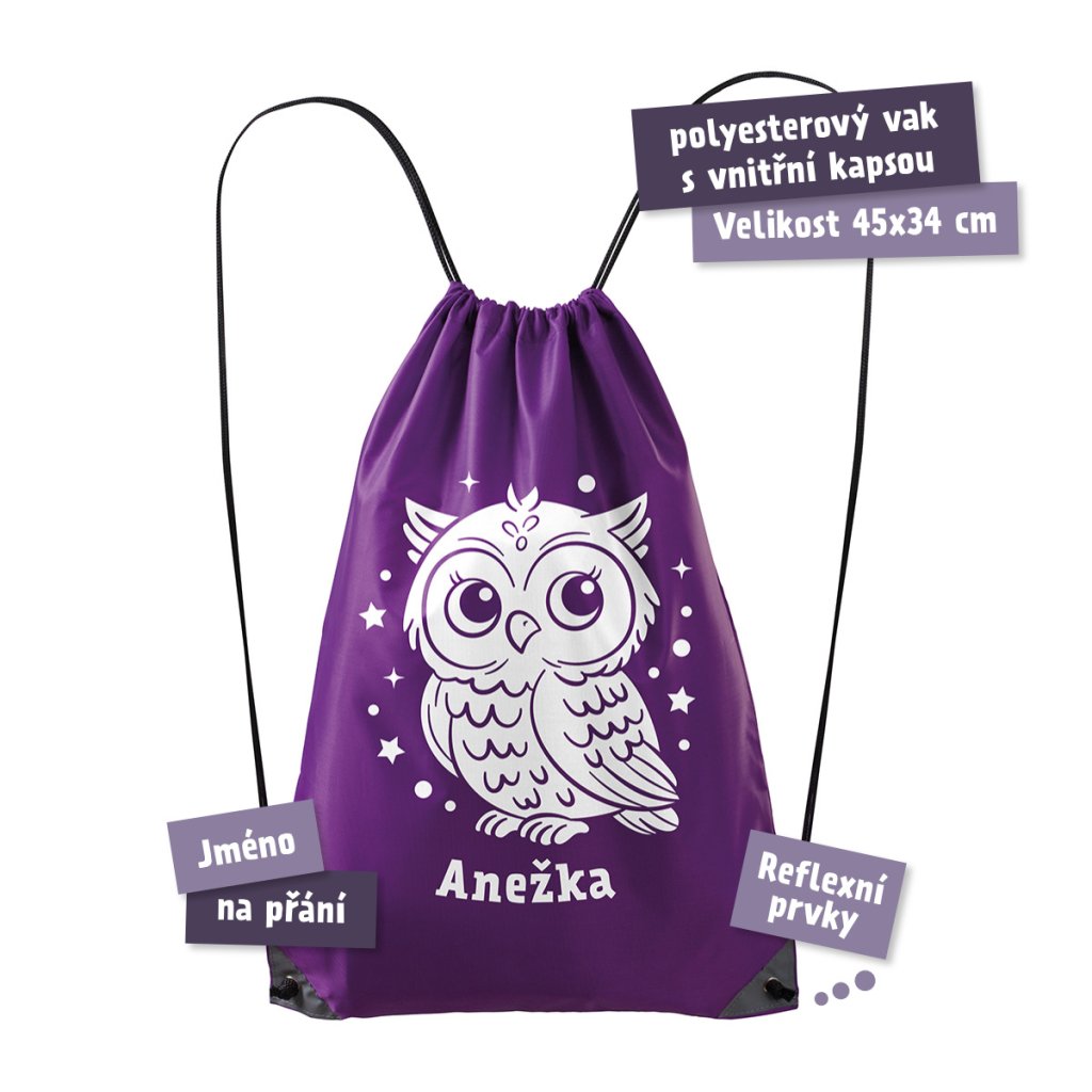 Lehký a odolný polyesterový vak s motivem a jménem na přání – ideální do školky, školy, na tréninky i výlety. Praktická vnitřní kapsa, reflexní prvky a kvalitní potisk z něj dělají skvělý osobní dárek, který si děti zamilují.