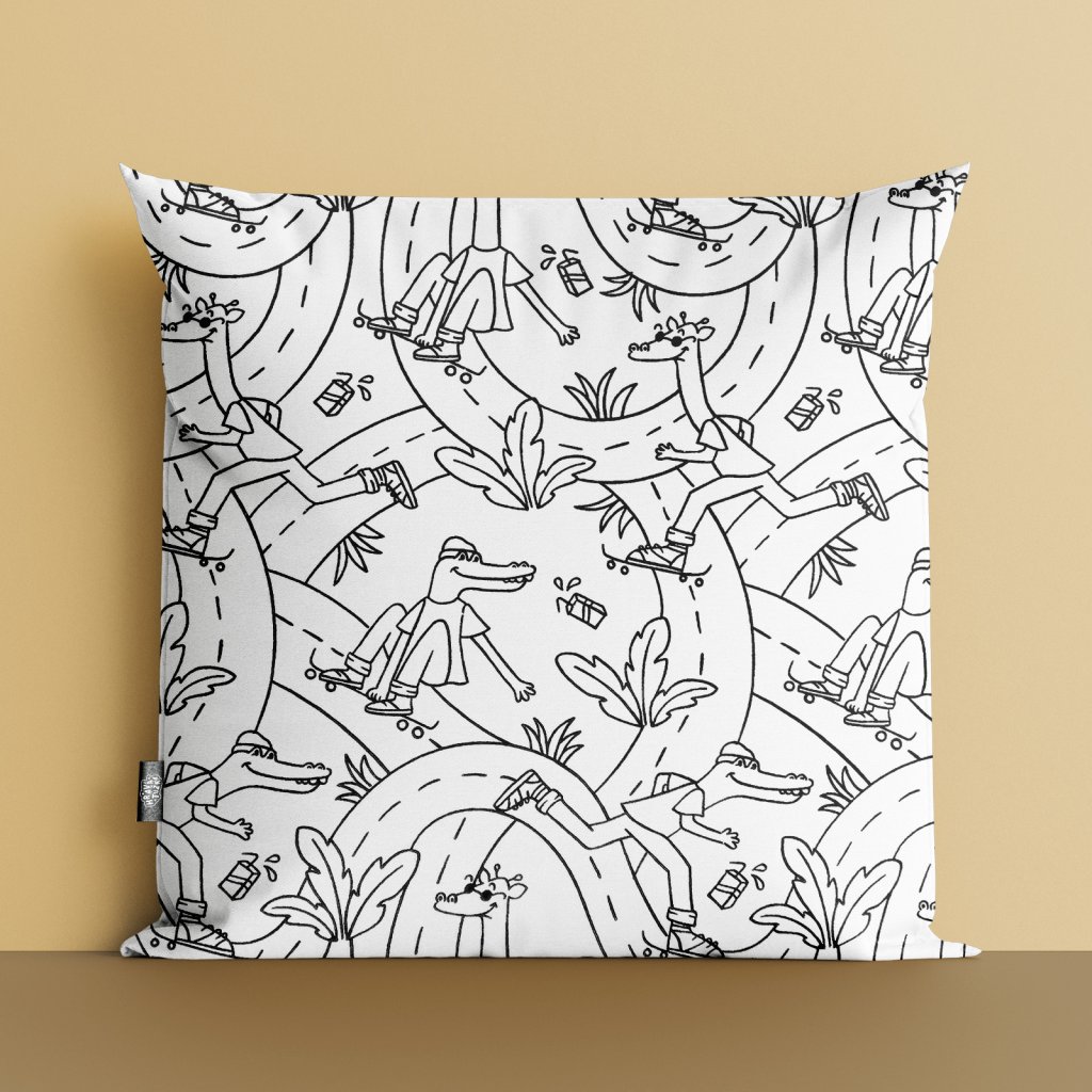 Polštářek omalovánky s motivem žirafy a krokodýla na skateboardu je jako cesta do fantastického světa, kde se neobvyklá zvířata stávají neohroženými skejťáky a projevují svou dobrodružnou stránku. Když vezmete do ruky barvy na textil, stáváte se tvůrcem této netradiční a hravé kombinace.